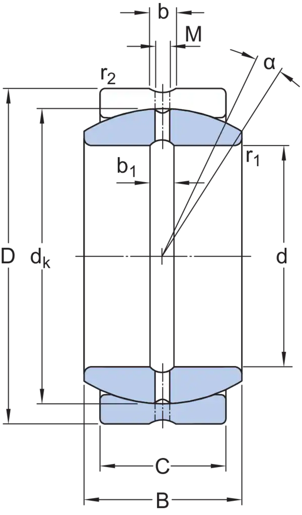 У этих радиальных сферических подшипников скольжения комбинация контактных поверхностей скольжения сталь/сталь. Они требуют технического обслуживания и могут повторно смазываться через смазочные отверстия и кольцевую канавку на обоих кольцах.