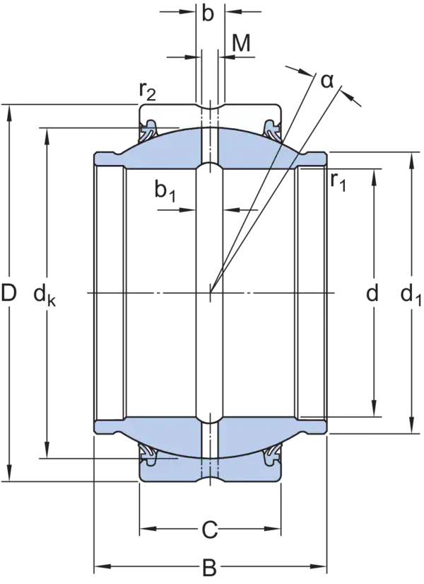 У этих радиальных сферических подшипников скольжения комбинация контактных поверхностей скольжения сталь/сталь и двухкромочные контактные уплотнения с обеих сторон и широкое внутреннее кольцо. Они требуют технического обслуживания и могут повторно смазываться через смазочные отверстия и кольцевую канавку на обоих кольцах.