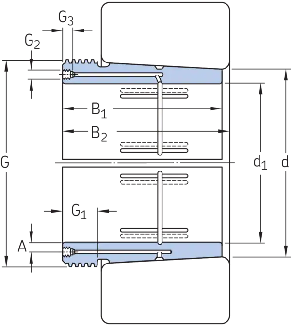 Стяжные втулки представляют собой разрезные конические втулки, которые используются для монтажа подшипников с коническим отверстием на цилиндрических посадочных местах ступенчатых валов. Размеры этой втулки AOH(X) соответствуют стандартам ISO, а её конструкция разработана для монтажа и демонтажа по методу гидрораспора. Втулка фиксируется на валу при помощи стопорной гайки или торцевой пластины. Стопорные гайки и соответствующее стопорное устройство заказываются отдельно. SKF не производит торцевые пластины.