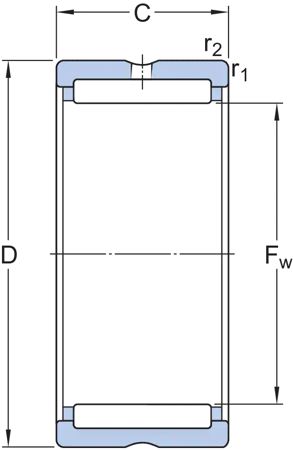 Однорядные игольчатые роликоподшипники без внутреннего кольца состоят из наружного кольца с комплектом игольчатых роликов с сепаратором. Оптимальный выбор для компактных подшипниковых узлов, когда в качестве дорожки качения может использоваться закалённая шлифованная поверхность вала. Наружное кольцо включает два встроенных фланца для направления подшипника в осевом направлении и кольцевую канавку с одним или несколькими смазочными отверстиями для упрощения повторной смазки.