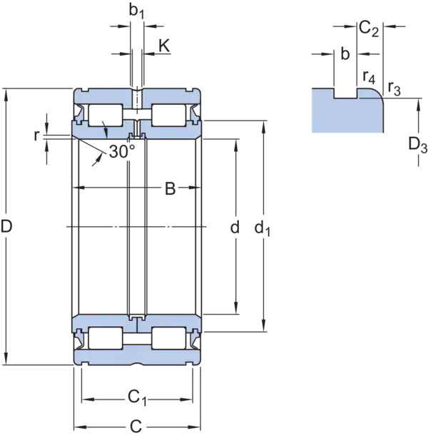 Двухрядные бессепараторные цилиндрические роликоподшипники содержат максимальное количество роликов и поэтому способны воспринимать очень большие радиальные нагрузки при средних частотах вращения. С тремя фланцами на разъёмном внутреннем кольце и одним центральным фланцем на наружном кольце, подшипники типа NNF могут использоваться для осевой фиксации вала в обоих направлениях. Две канавки под стопорные кольца, расположенные на наружном кольце, упрощают монтаж и экономят пространство в осевом направлении.