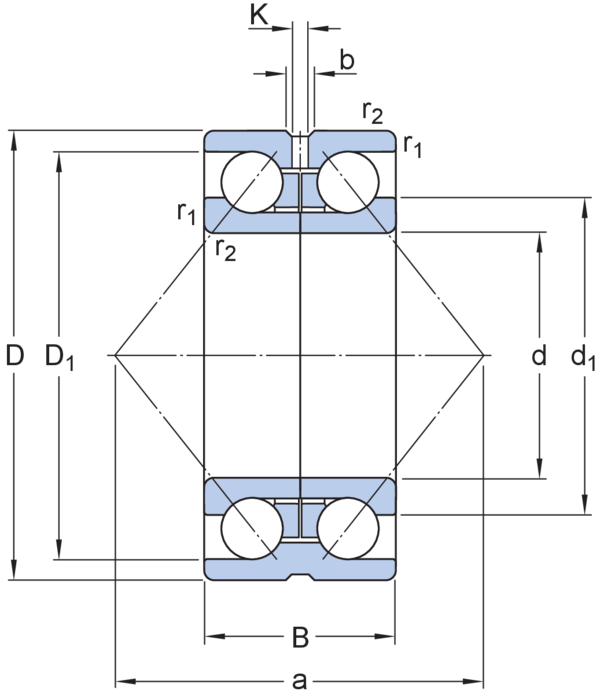 Двухрядные радиально-упорные шарикоподшипники с разъёмным внутренним кольцом и элементами для повторного смазывания соответствуют паре однорядных радиально-упорных шарикоподшипников, установленных по О-образной схеме. Разъёмное внутреннее кольцо позволяет разместить большее количество шариков, и обеспечить таким образом более высокую грузоподъёмность. Кольцевая канавка и отверстия для смазывания на наружном кольце облегчают повторное смазывание.