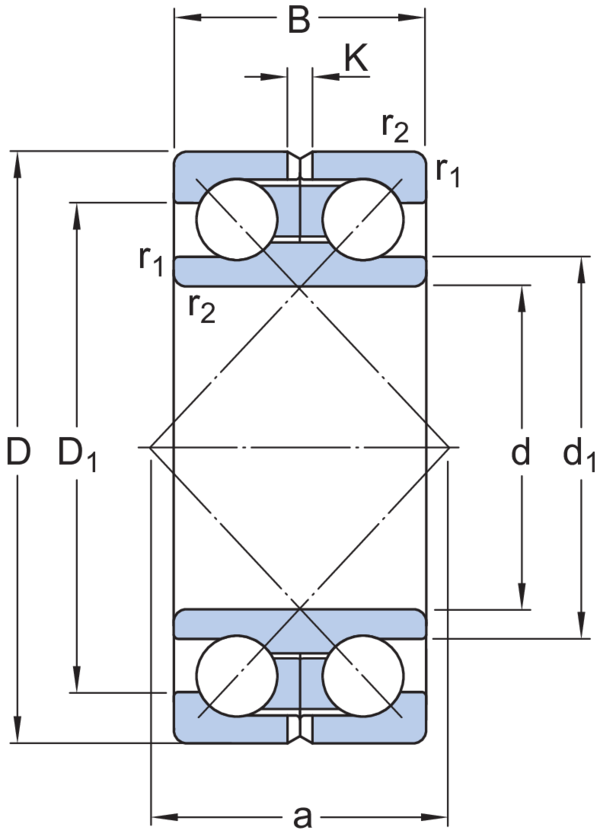 Двухрядные радиально-упорные шарикоподшипники с разъёмным наружным кольцом соответствуют паре однорядных радиально-упорных шарикоподшипников, установленных по О-образной схеме, но меньше по ширине. Могут работать при очень высоких частотах вращения и больше, чем радиальные шарикоподшипники, подходят для поддержки больших осевых усилий.