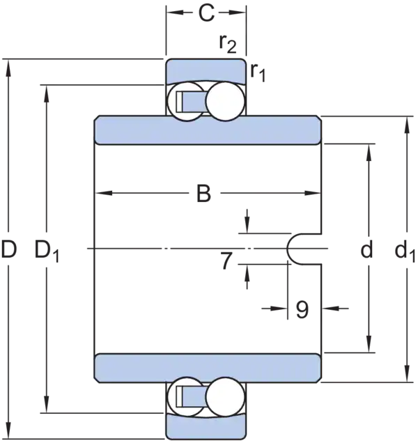 Самоустанавливающиеся шарикоподшипники с широким внутренним кольцом имеют два ряда шариков, общую сферическую дорожку качения на наружном кольце, а также две дорожки качения на внутреннем кольце. Нечувствительны к угловым перекосам вала относительно корпуса. Широкое внутреннее кольцо позволяет использовать промышленные валы и осевую фиксацию на валу с помощью паза на одном из торцов внутреннего кольца.