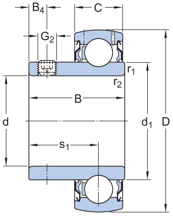 Корпусные подшипники сконструированы на основе уплотнённых радиальных шарикоподшипников. Такой вариант корпусного подшипника применяется в условиях постоянного и переменного направления вращения. Внутреннее кольцо расширено с одной стороны, а его фиксация на валу осуществляется путем затягивания двух (установочных) винтов на внутреннем кольце.