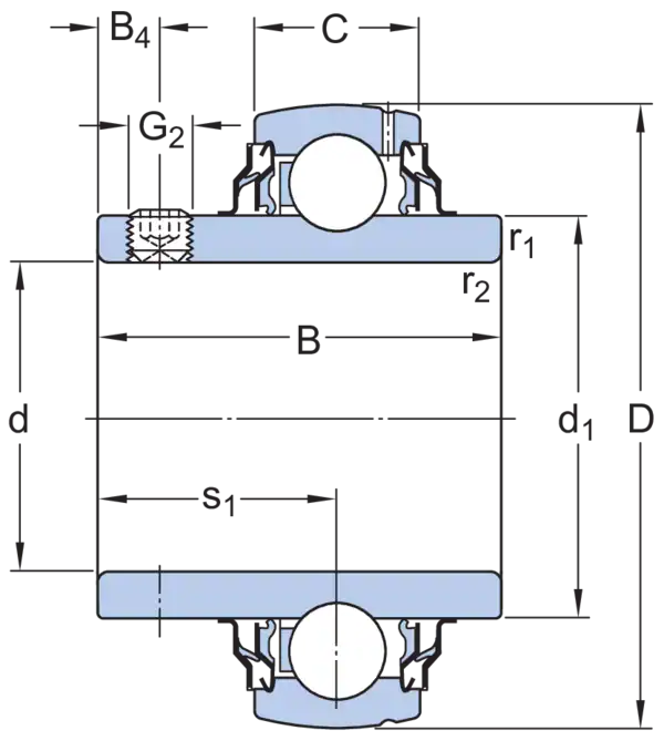 Корпусные подшипники сконструированы на основе уплотнённых радиальных шарикоподшипников. Такой вариант применяется в условиях постоянного и переменного направления вращения. Внутреннее кольцо расширено с обеих сторон, а его фиксация на валу осуществляется путем затягивания двух (установочных) винтов на внутреннем кольце, что упрощает монтаж.
