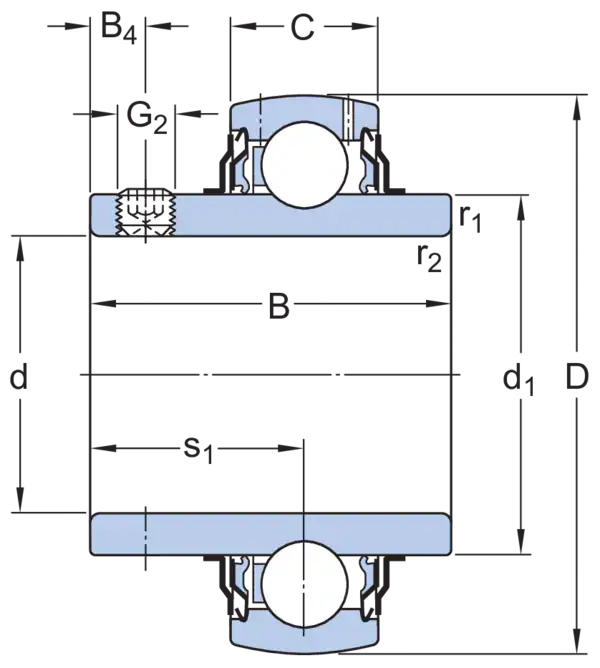 Корпусные подшипники сконструированы на основе уплотнённых радиальных шарикоподшипников. Такой вариант применяется в условиях постоянного и переменного направления вращения. Внутреннее кольцо расширено с обеих сторон, а его фиксация на валу осуществляется путем затягивания двух (установочных) винтов на внутреннем кольце, что упрощает монтаж.