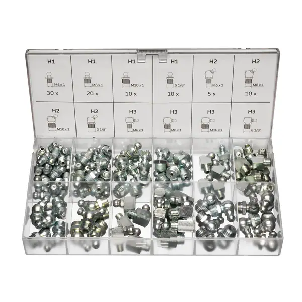 Комплект пресс-маслёнок содержит полный набор из 120 стандартизированных конических пресс-маслёнок.